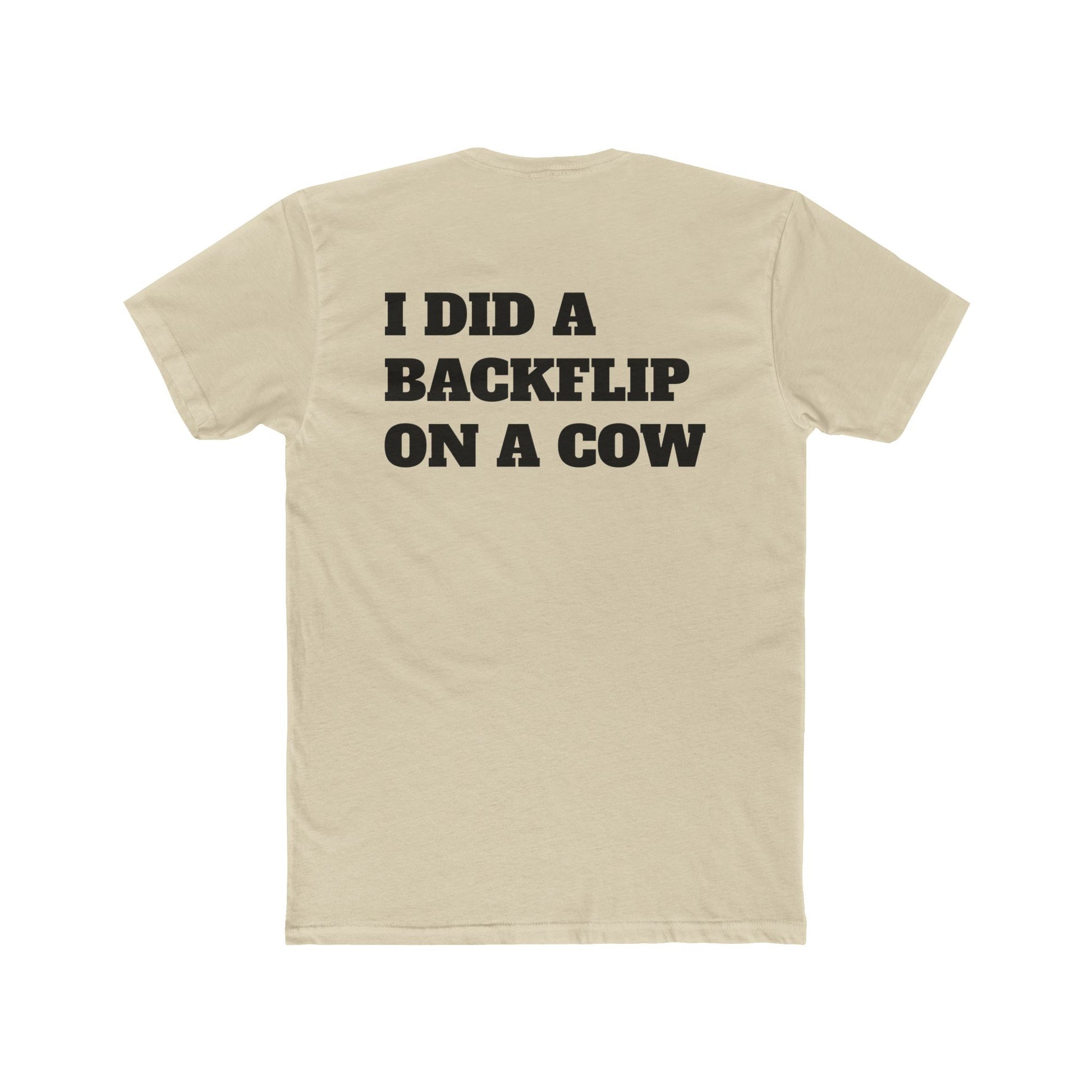 Lightweight and unapologetically playful, this cotton crew tee carries a wink on the chest and a bold laugh on the back. The small circular chest emblem hints at cheeky mischief, while the back proclaims “I DID A BACKFLIP ON A COW” in bold type — a statement piece for people who love absurd humor and easygoing style. The soft, 4.3 oz fabric sits comfortably all day and layers neatly under jackets. Built with side seams, shoulder tape, and a ribbed knit collar, it holds its shape through repeat wears and washes. Printed using durable DTF transfers, the sleeve and body graphics stay vivid and tactile. Wear it to backyard barbecues, local shows, or road trips that welcome a good story and a laugh.